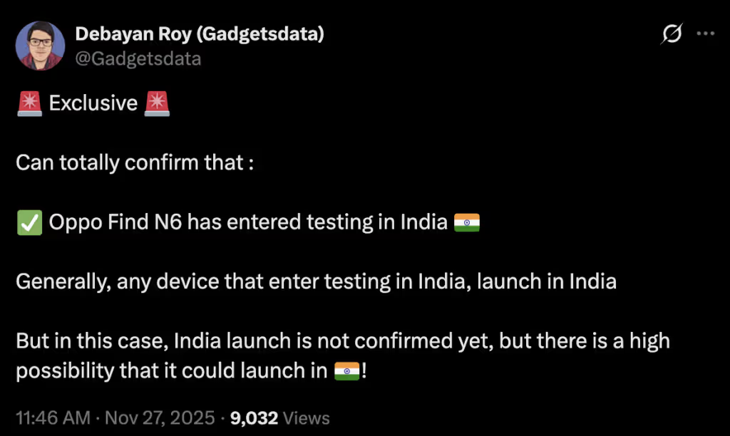 According to well-known tipster Debayan Roy, the Find N6 has already entered the testing phase in India. This usually indicates that a brand is evaluating a possible launch in the country, as internal testing often happens a few months before rollout. However, Roy also clarified that the India launch is “not confirmed yet,” meaning OPPO has not taken a final call at this stage.